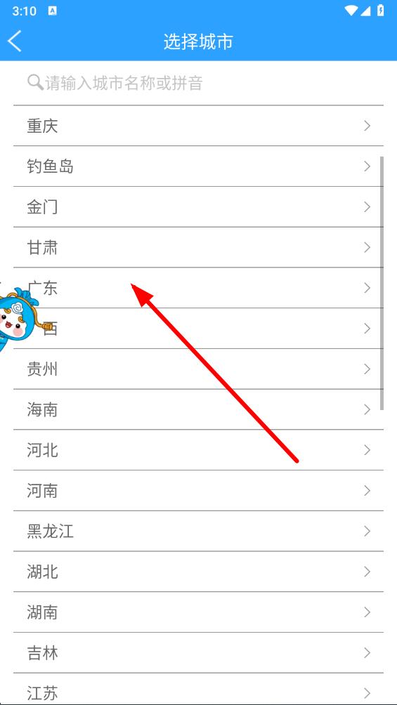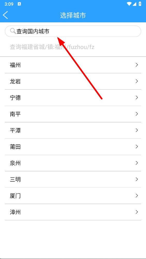 3、在選擇城市頁(yè)面,可以直接在下方列表中點(diǎn)擊想要添加的區(qū)域,若沒(méi)有,點(diǎn)擊搜索框。