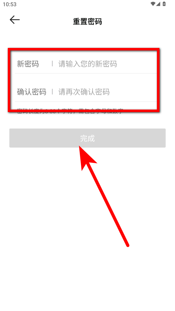 4、在重置密碼界面,輸入新密碼和確認密碼,點擊完成,可完成密碼重置。