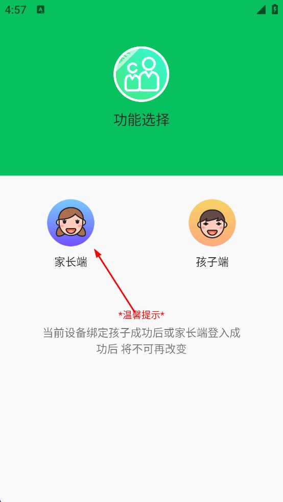 1、打開家長端APP,進入功能選擇頁面,點擊“家長端”,進入家長端主界面。