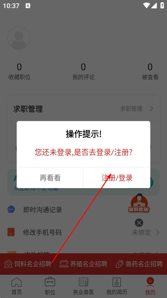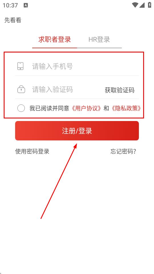 4、在求職者登錄頁面,輸入手機號,輸入驗證碼,勾選我已閱讀并同意用戶協(xié)議和隱私政策,點擊注冊/登錄。