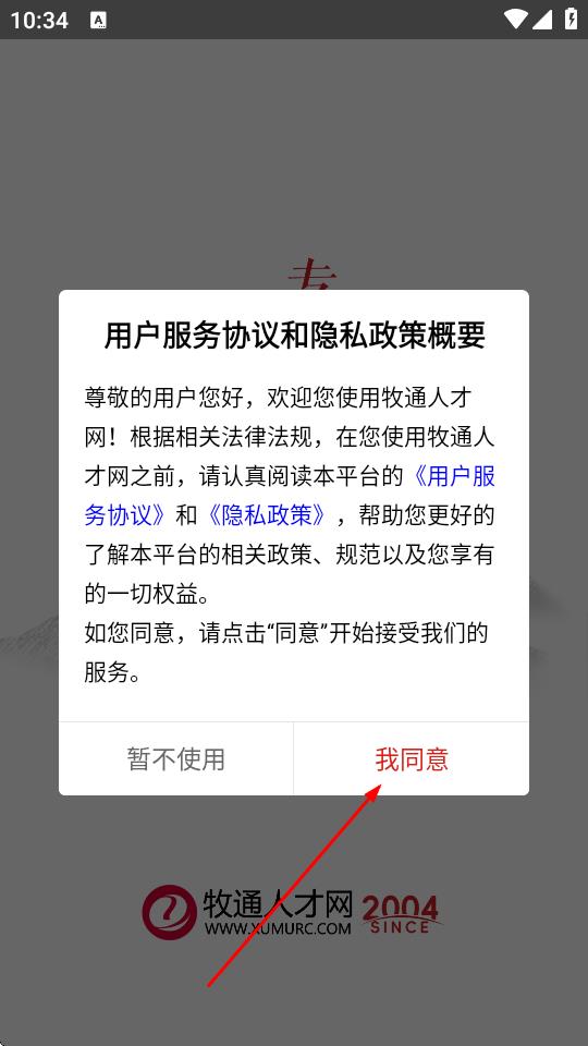 1、打開牧通人才網(wǎng)APP,在彈出的用戶服務協(xié)議和隱私政策概要窗口中,點擊我同意。