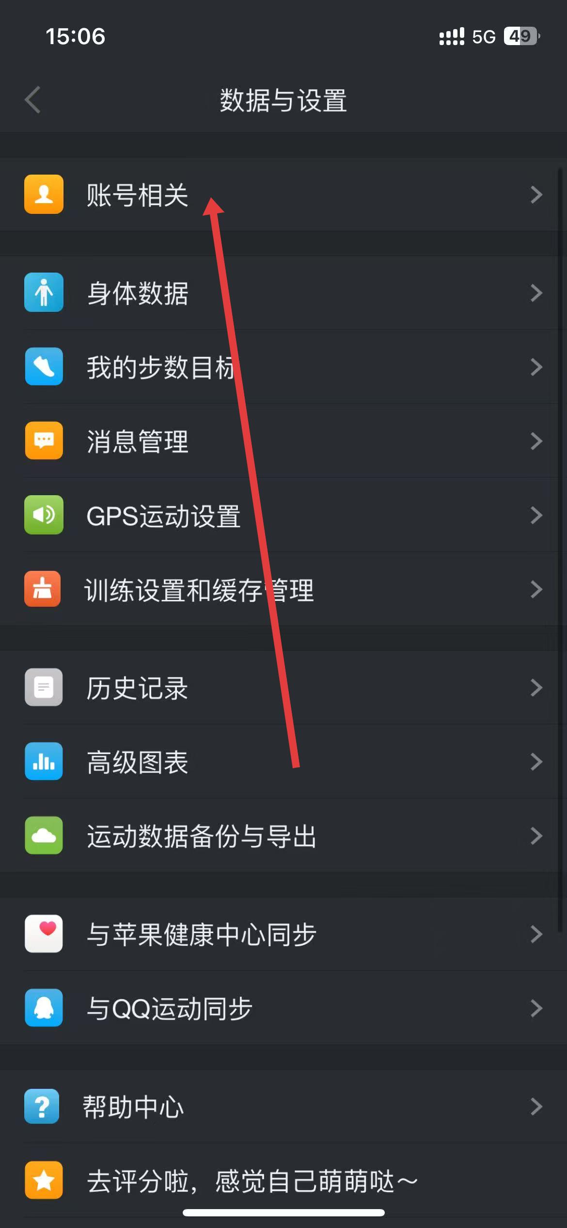 3、在數(shù)據(jù)與設(shè)置頁面,找到并點擊賬號相關(guān)選項。