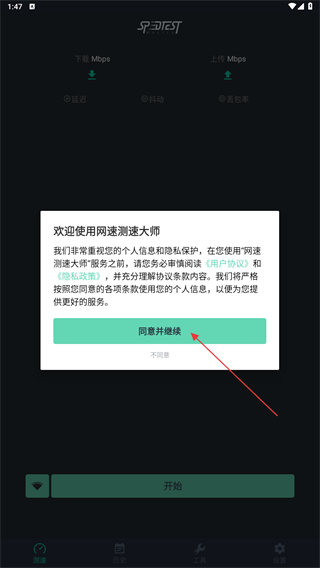 1、打開網(wǎng)速測(cè)試大師APP,進(jìn)入時(shí)會(huì)彈出使用須知,點(diǎn)擊同意并繼續(xù)的按鈕。