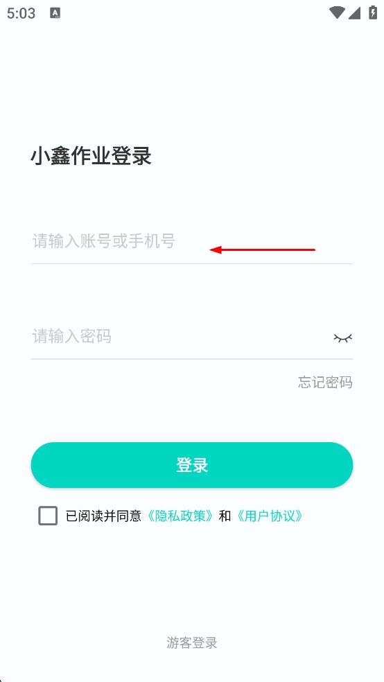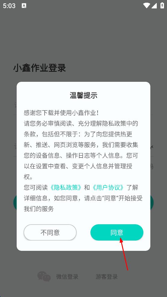 1、打開小鑫作業(yè)APP,出現(xiàn)溫馨提示界面,仔細(xì)閱讀后點(diǎn)擊“同意”,進(jìn)入登錄頁面。