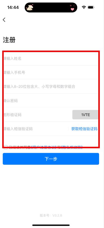 2、在注冊(cè)頁(yè)面,依次輸入姓名、手機(jī)號(hào)、密碼、確認(rèn)密碼、圖形驗(yàn)證碼。