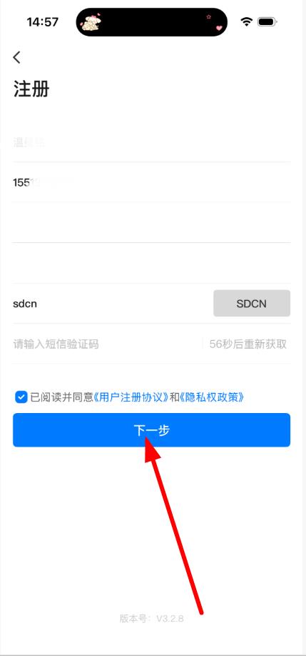 3、輸入完成以后,收到短信驗(yàn)證碼后輸入,并勾選同意相關(guān)協(xié)議,再點(diǎn)擊下一步。