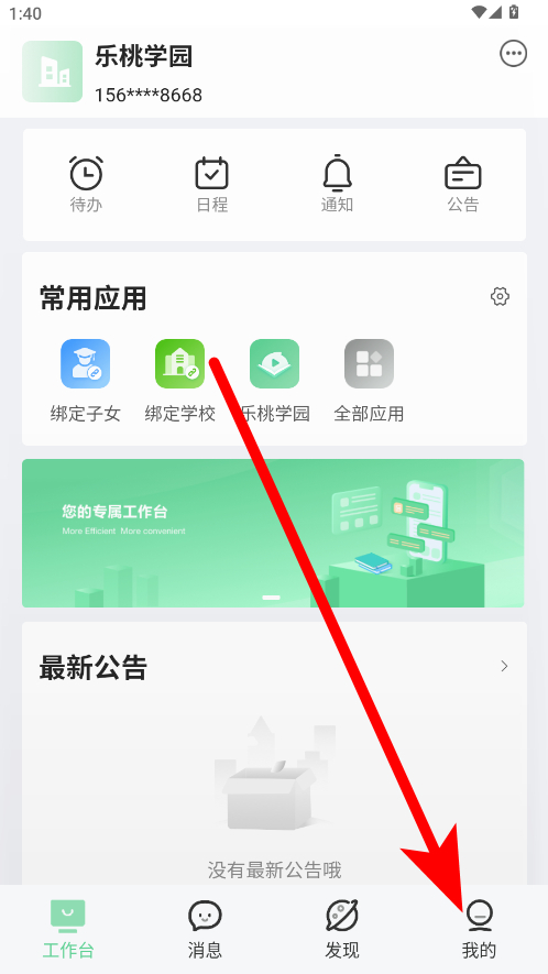 1、打開(kāi)樂(lè)桃學(xué)園APP,點(diǎn)擊底部我的選項(xiàng)進(jìn)入個(gè)人界面。