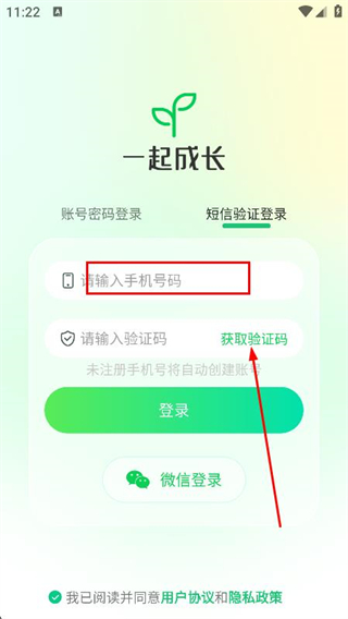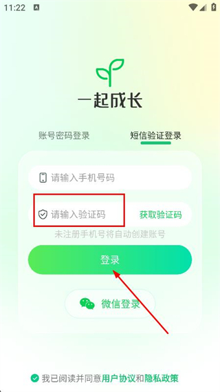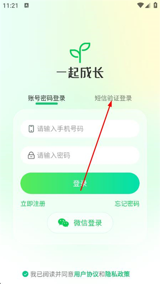 1、打開一起成長(zhǎng)APP,點(diǎn)擊上方的短信驗(yàn)證登錄選項(xiàng)。
