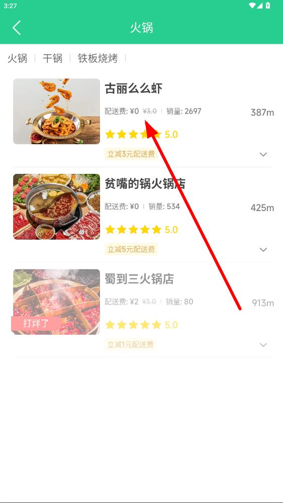 3、以火鍋為例,點(diǎn)擊后會(huì)顯示火鍋類的商家列表,選擇一家你想訂餐的商家,如古麗么么蝦。