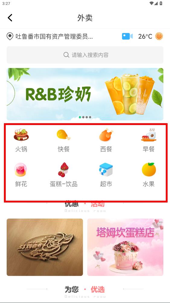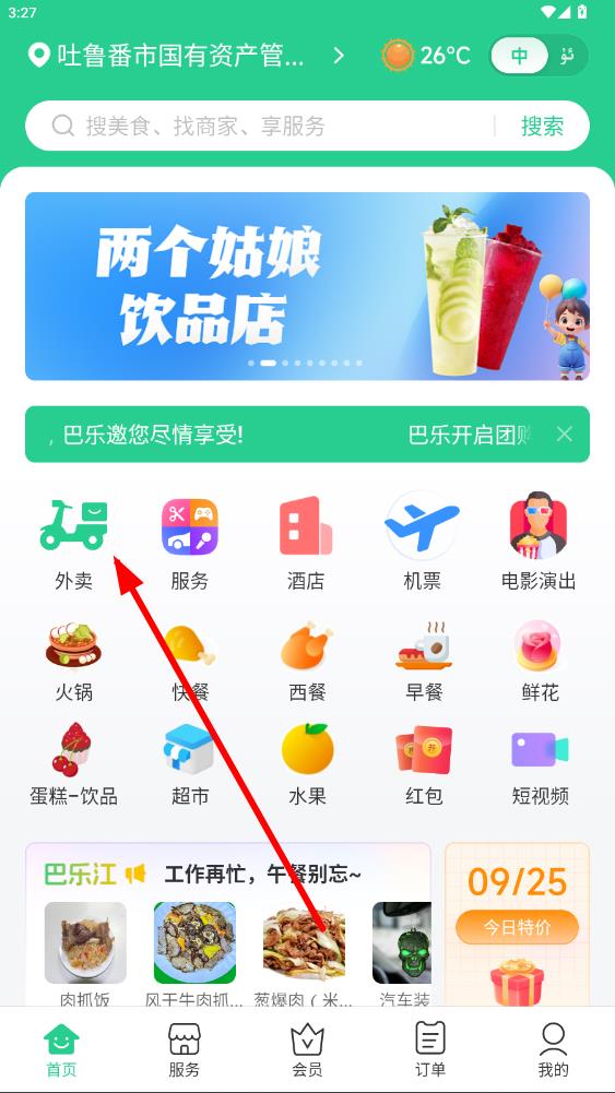 1、打開baray外賣平臺(tái)APP,進(jìn)入首頁后,點(diǎn)擊外賣圖標(biāo)。