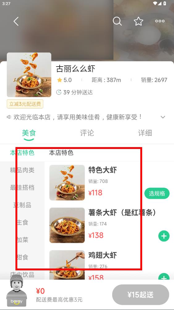 4、進(jìn)入商家頁面,瀏覽店內(nèi)菜品,點(diǎn)擊選規(guī)格或加號,選擇菜品規(guī)格并加入購物車,選好后結(jié)算下單即可。