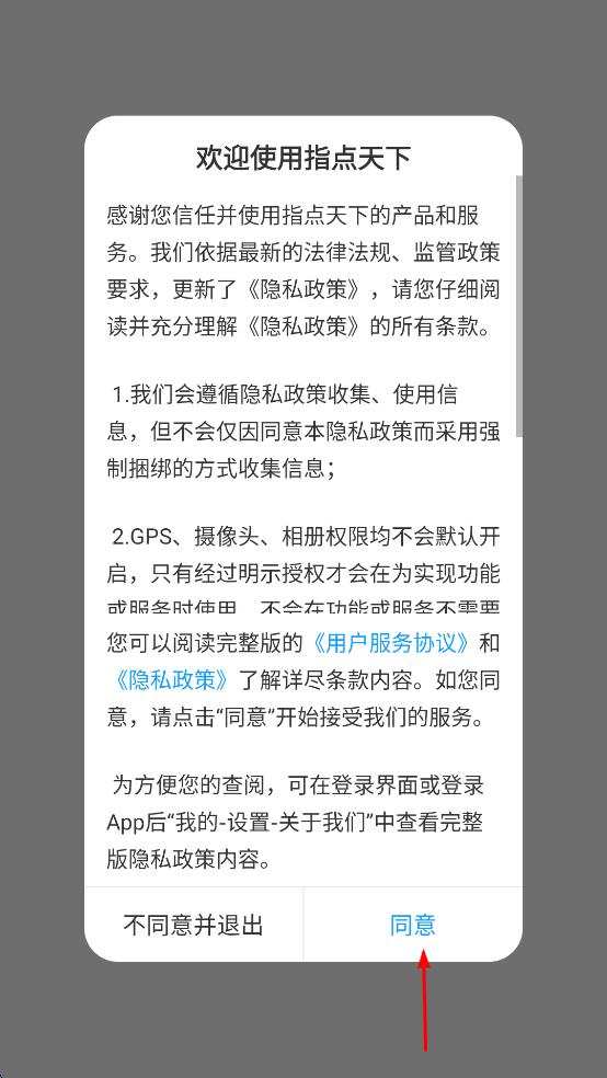 1、打開指點天下app,會彈出歡迎使用提示框,提示閱讀隱私政策等內(nèi)容,仔細閱讀后,若同意,點擊“同意”按鈕。