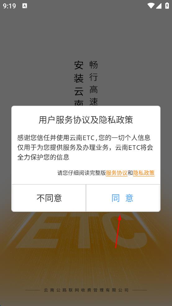 1、打開(kāi)云南ETC軟件,會(huì)彈出用戶服務(wù)協(xié)議及隱私政策提示框,仔細(xì)閱讀后,點(diǎn)擊同意按鈕。