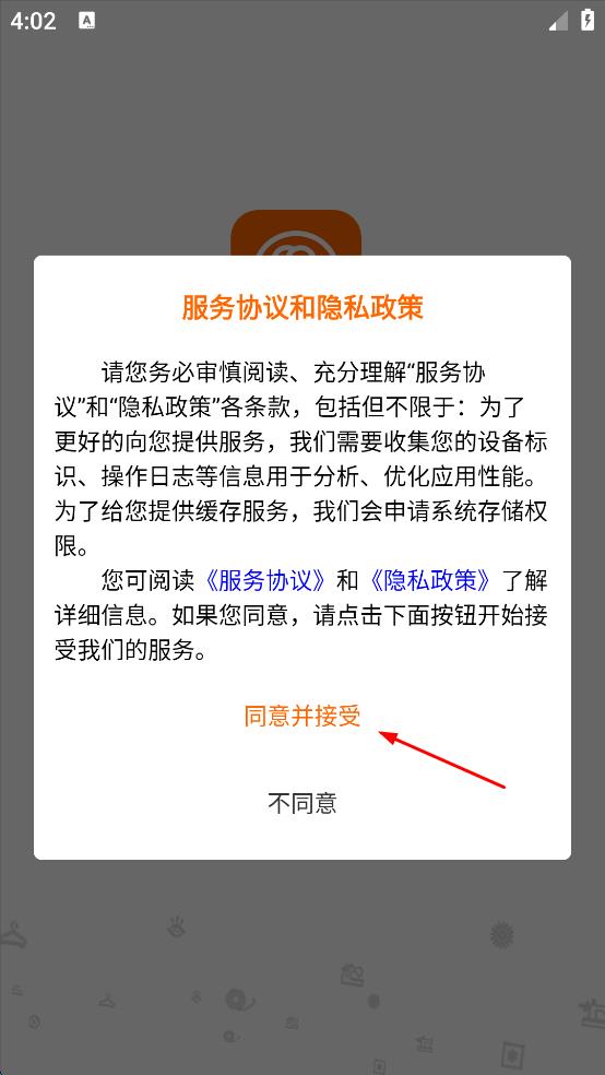 1、打開棉花果APP,出現(xiàn)服務(wù)協(xié)議和隱私政策界面,仔細閱讀后點擊“同意并接受”,進入登錄選擇頁面。