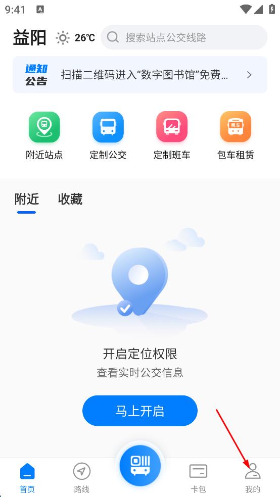 1、打開益陽公交軟件,進入首頁后,點擊頁面右下角的“我的”選項。
