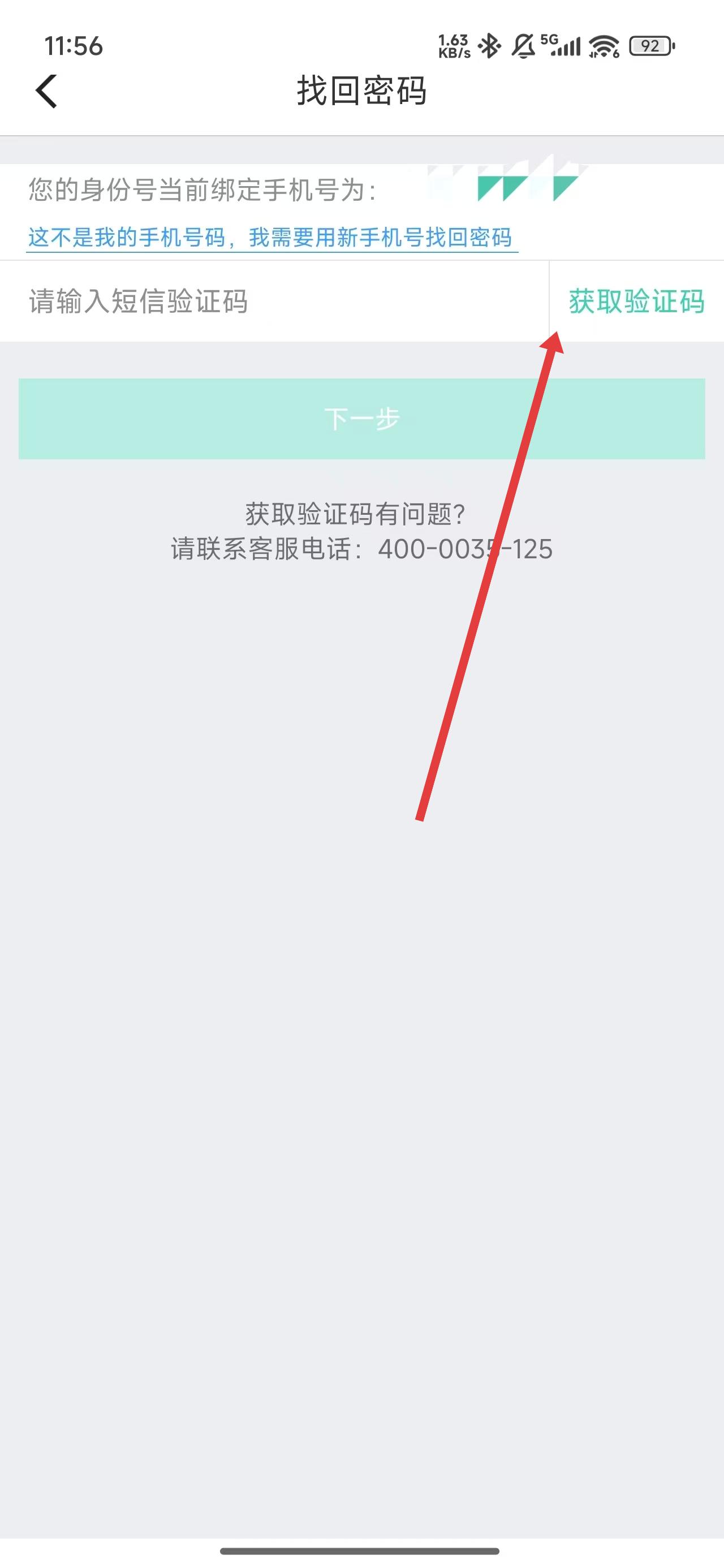 3、通過點(diǎn)擊獲取驗(yàn)證碼按鈕,等待填寫收到的驗(yàn)證碼后,進(jìn)入最后一步。