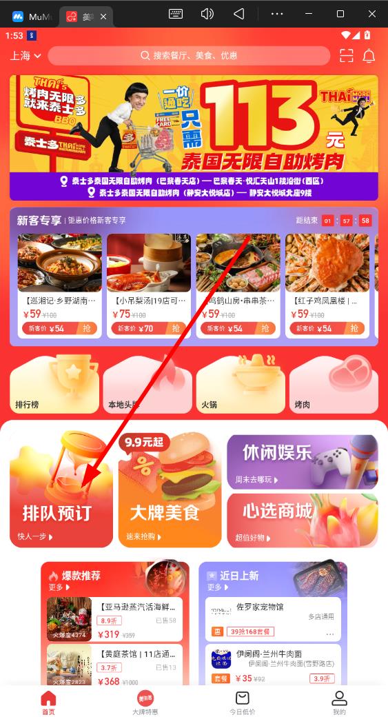 1、打開美味不用等app,在首頁點擊排隊預(yù)訂進入排隊頁面。