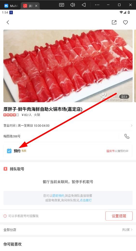 3、進入所選餐廳頁面后,點擊預(yù)約按鈕,進行排隊預(yù)約操作。