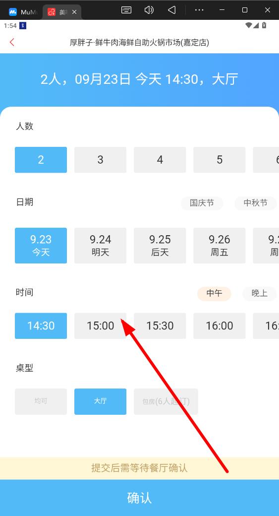 4、在預(yù)約頁面選擇就餐人數(shù)、日期、時間以及桌型等信息,確認(rèn)后提交等待餐廳確認(rèn)。