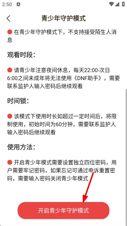4、點擊開啟青少年守護模式按鈕,按照提示設(shè)置獨立四位密碼,即可成功開啟青少年模式。