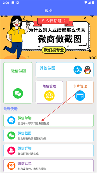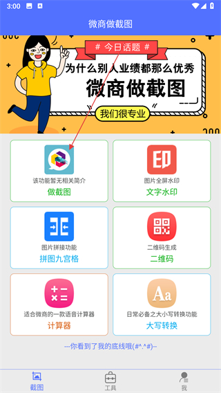 1、打開微商做截圖軟件,在首頁點(diǎn)擊做截圖功能,進(jìn)入截圖類型選擇頁面。