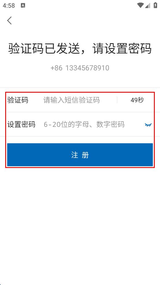 4、輸入收到的短信驗(yàn)證碼,設(shè)置6 - 20位的字母、數(shù)字密碼,點(diǎn)擊注冊(cè)。