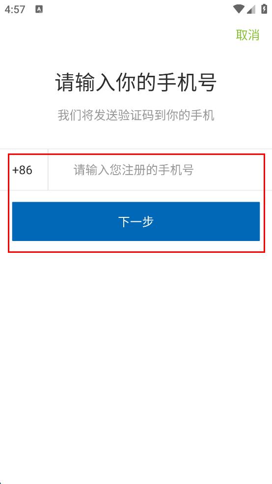3、在注冊(cè)頁(yè)面輸入手機(jī)號(hào)碼,點(diǎn)擊下一步,等待接收驗(yàn)證碼。