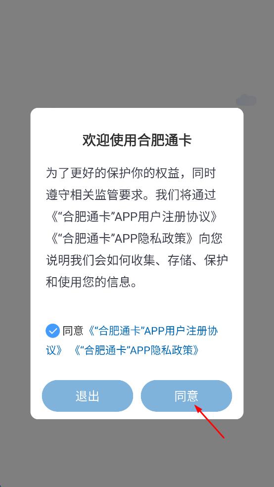 1、打開合肥通卡,出現(xiàn)歡迎使用合肥通卡提示框,點(diǎn)擊同意。