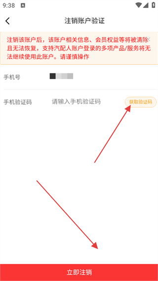 6、點(diǎn)擊獲取驗(yàn)證碼,輸入收到的手機(jī)驗(yàn)證碼后,點(diǎn)擊立即注銷。