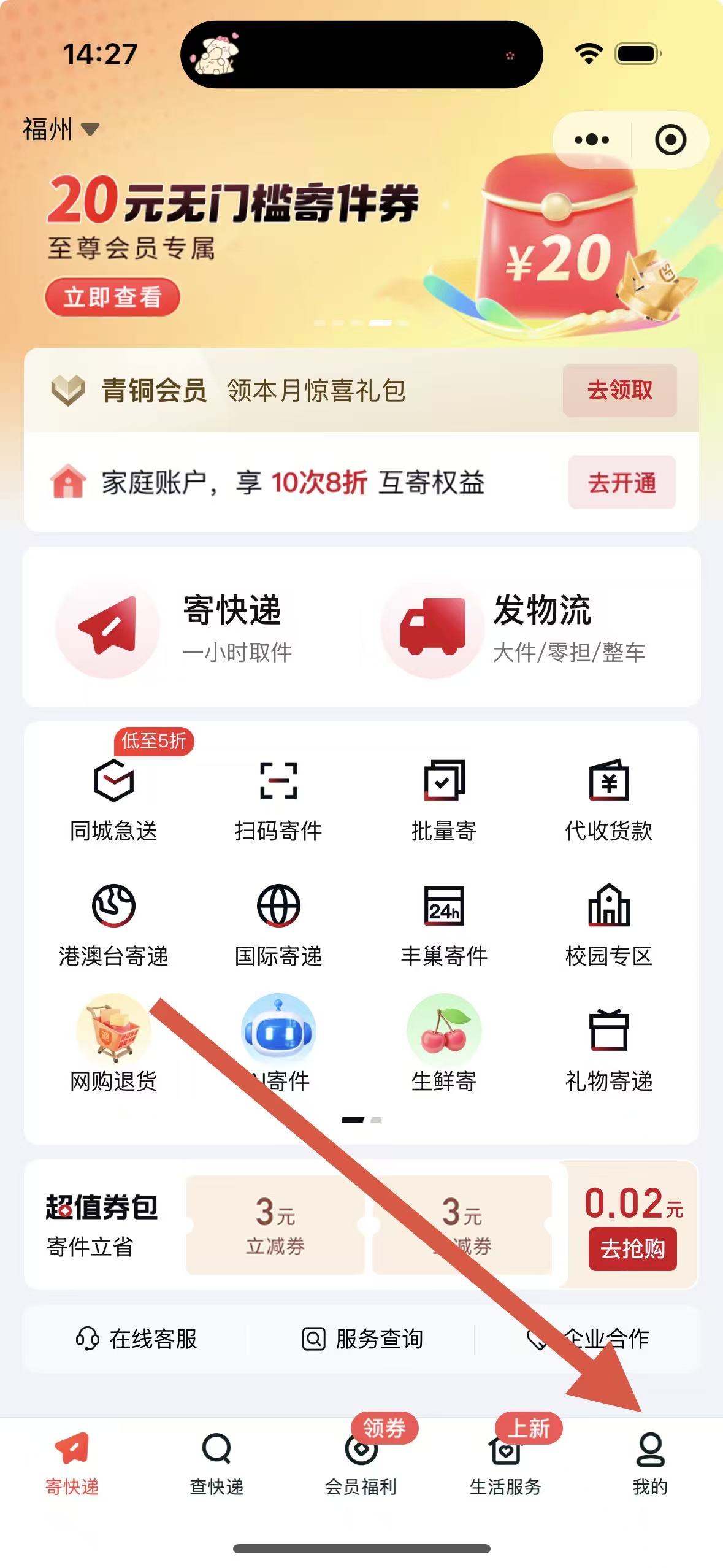 1、在順豐速運(yùn)APP首頁(yè),點(diǎn)擊右下角我的選項(xiàng),進(jìn)入個(gè)人頁(yè)面。