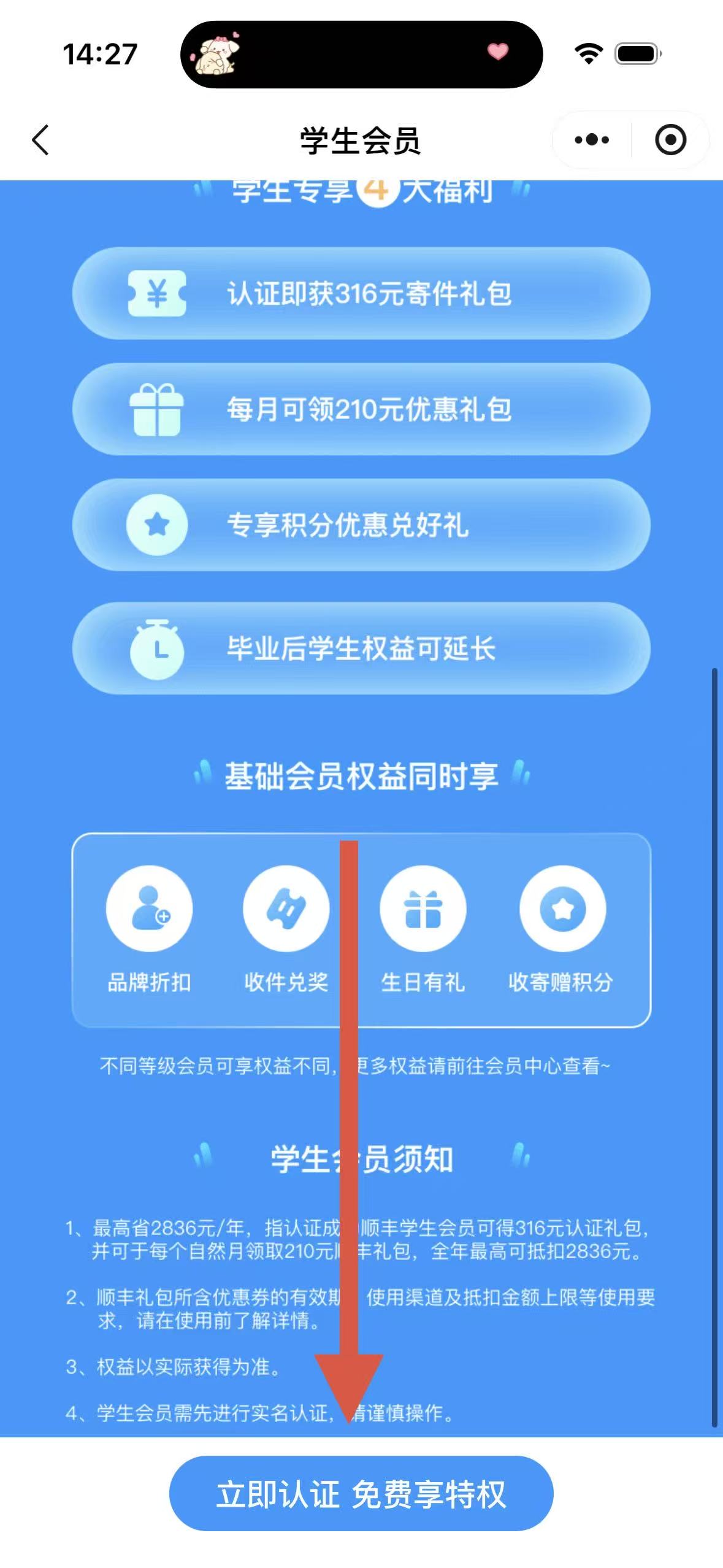 4、點(diǎn)擊學(xué)生認(rèn)證,進(jìn)入學(xué)生會(huì)員頁(yè)面,點(diǎn)擊立即認(rèn)證免費(fèi)享特權(quán)按鈕即可。