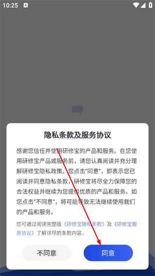 1、打開(kāi)研修寶app,在彈出的隱私條款中點(diǎn)擊同意。