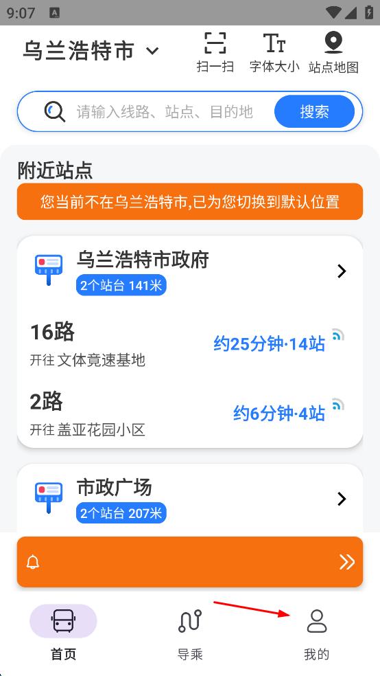 1、打開公交查詢軟件,進入首頁后,點擊頁面底部右側的“我的”選項,進入個人中心頁面。