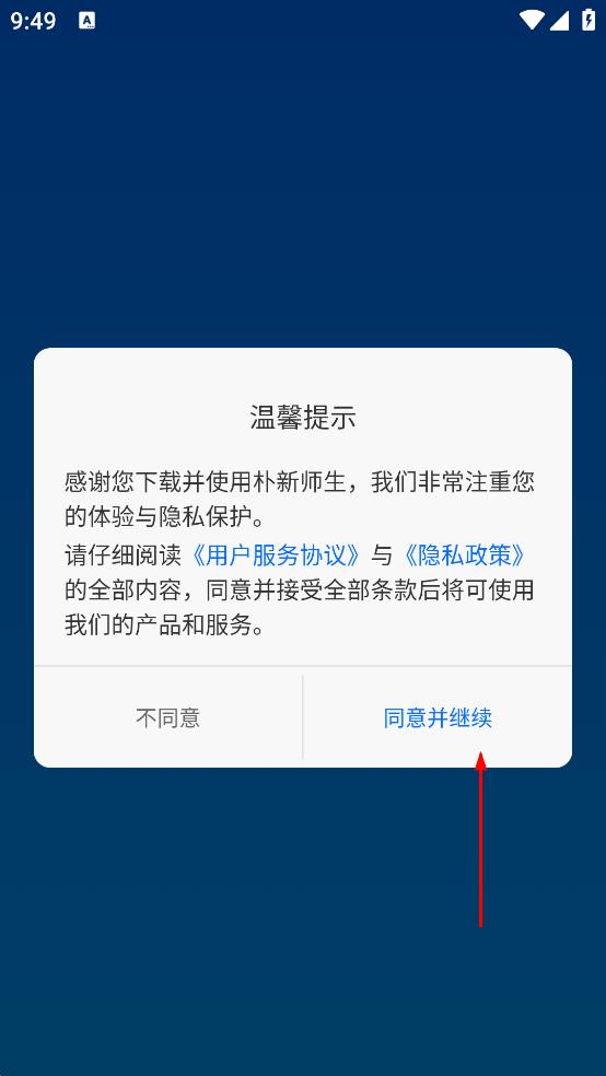 1、打開樸新師生App,會彈出溫馨提示框,仔細(xì)閱讀相關(guān)內(nèi)容后,點擊同意并繼續(xù)按鈕。