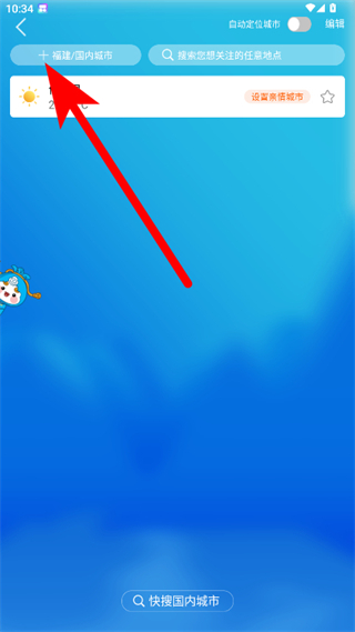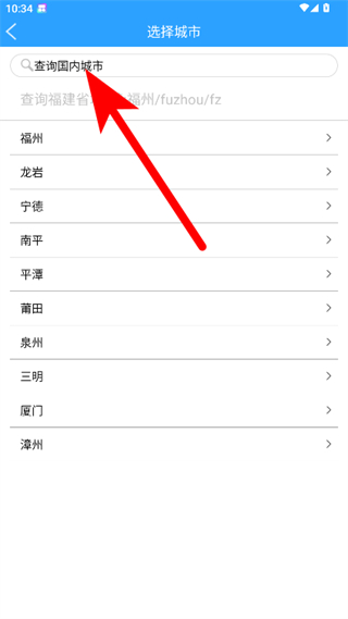 2、在城市管理界面,點(diǎn)擊福建/國內(nèi)城市選項(xiàng),進(jìn)入選擇城市頁面。