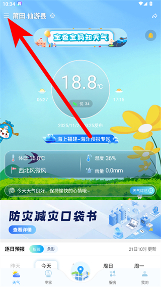 1、在知天氣APP首頁,點(diǎn)擊左上角三條橫線圖標(biāo),進(jìn)入城市管理界面。