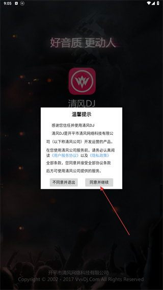 1、啟動(dòng)清風(fēng)dj的應(yīng)用軟件,進(jìn)入時(shí)會(huì)彈出溫馨提示,點(diǎn)擊同意并繼續(xù)的按鈕。