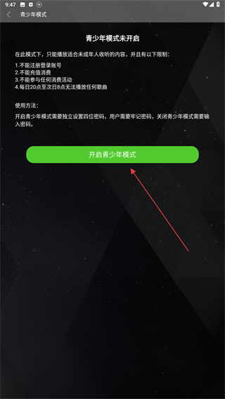 4、進(jìn)入青少年模式的頁面內(nèi),仔細(xì)閱讀后再點(diǎn)擊開啟青少年模式即可。