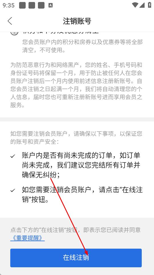 6、在注銷賬號頁面,點(diǎn)擊在線注銷。