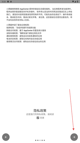 1、打開小黑屋APP,進(jìn)入時會彈出隱私政策,勾選同意后點擊右下角→的按鈕。