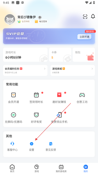 1、打開云電腦應(yīng)用,在個(gè)人頁(yè)面中,找到并點(diǎn)擊設(shè)置選項(xiàng),進(jìn)入設(shè)置界面。