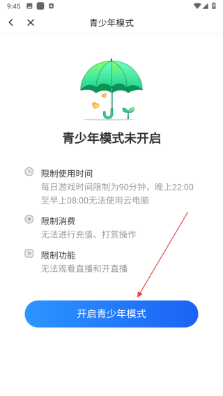 3、在青少年模式頁(yè)面,點(diǎn)擊開啟青少年模式按鈕。