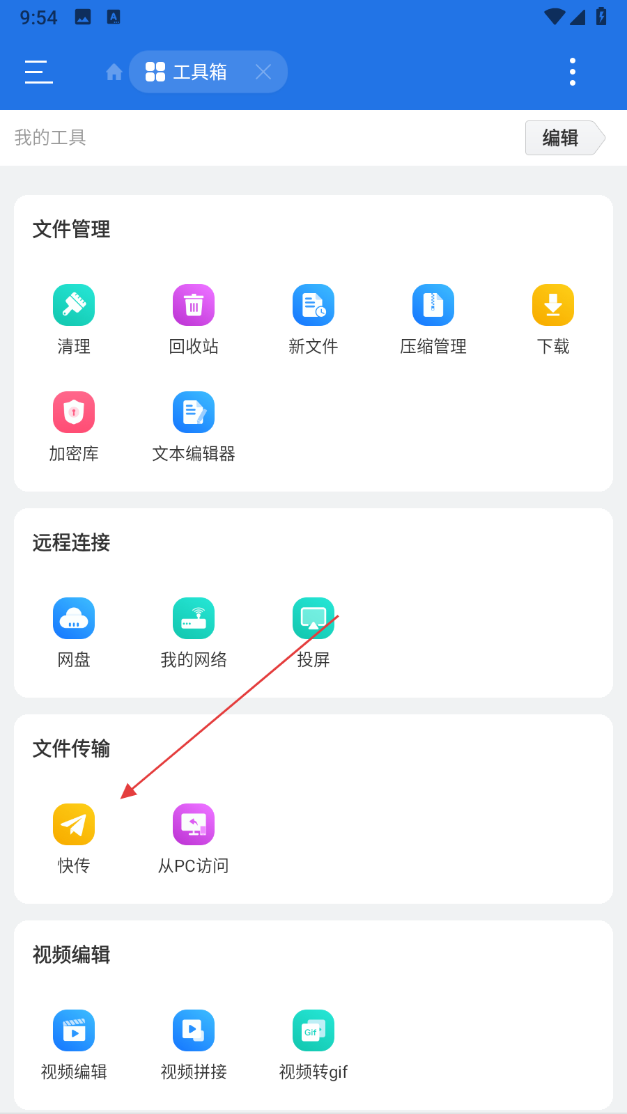 1、打開ES文件管理器app,點(diǎn)擊進(jìn)入工具箱,在文件傳輸板塊找到并點(diǎn)擊快傳,進(jìn)入快傳界面。