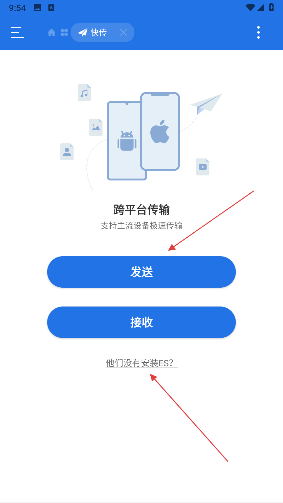 2、若雙方都裝ES,選好照片后,發(fā)送方點(diǎn)擊發(fā)送之后,等接收方點(diǎn)接收建立連接,如果對(duì)方?jīng)]有裝ES,就點(diǎn)擊他們沒有安裝ES。