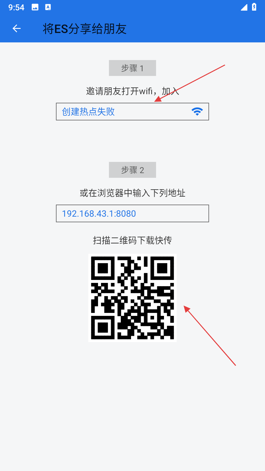 3、按提示嘗試創(chuàng)建熱點(diǎn)供對(duì)方連接,若創(chuàng)建熱點(diǎn)失敗,也可讓接收方在瀏覽器輸入顯示的地址,或者掃描二維碼下載快傳功能。