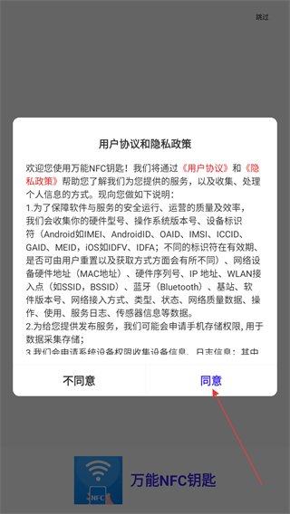 1、打開萬能NFC鑰匙APP,進(jìn)入時會彈出用戶協(xié)議和隱私政策,點(diǎn)擊同意的按鈕。