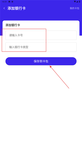 4、在添加的界面內(nèi),輸入要添加的銀行卡卡號以及類型,再點(diǎn)擊保存到卡包的按鈕即可。