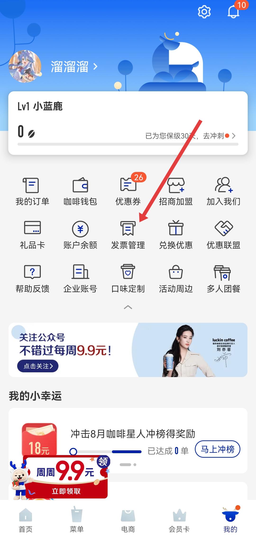 1、進(jìn)入瑞幸咖啡APP我的頁面,點擊發(fā)票管理選項,這是進(jìn)入發(fā)票開具流程的關(guān)鍵入口。