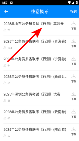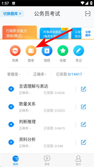 1、在公務(wù)員考試題庫(kù)頁(yè)面,點(diǎn)擊整卷按鈕,進(jìn)入整卷??嫉捻?yè)面。