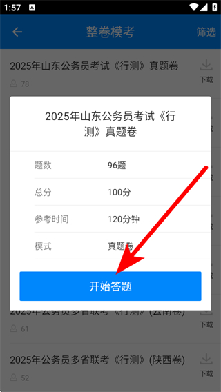 2、在整卷??嫉捻?yè)面,可以選擇目標(biāo)真題卷,彈出試卷詳情框。